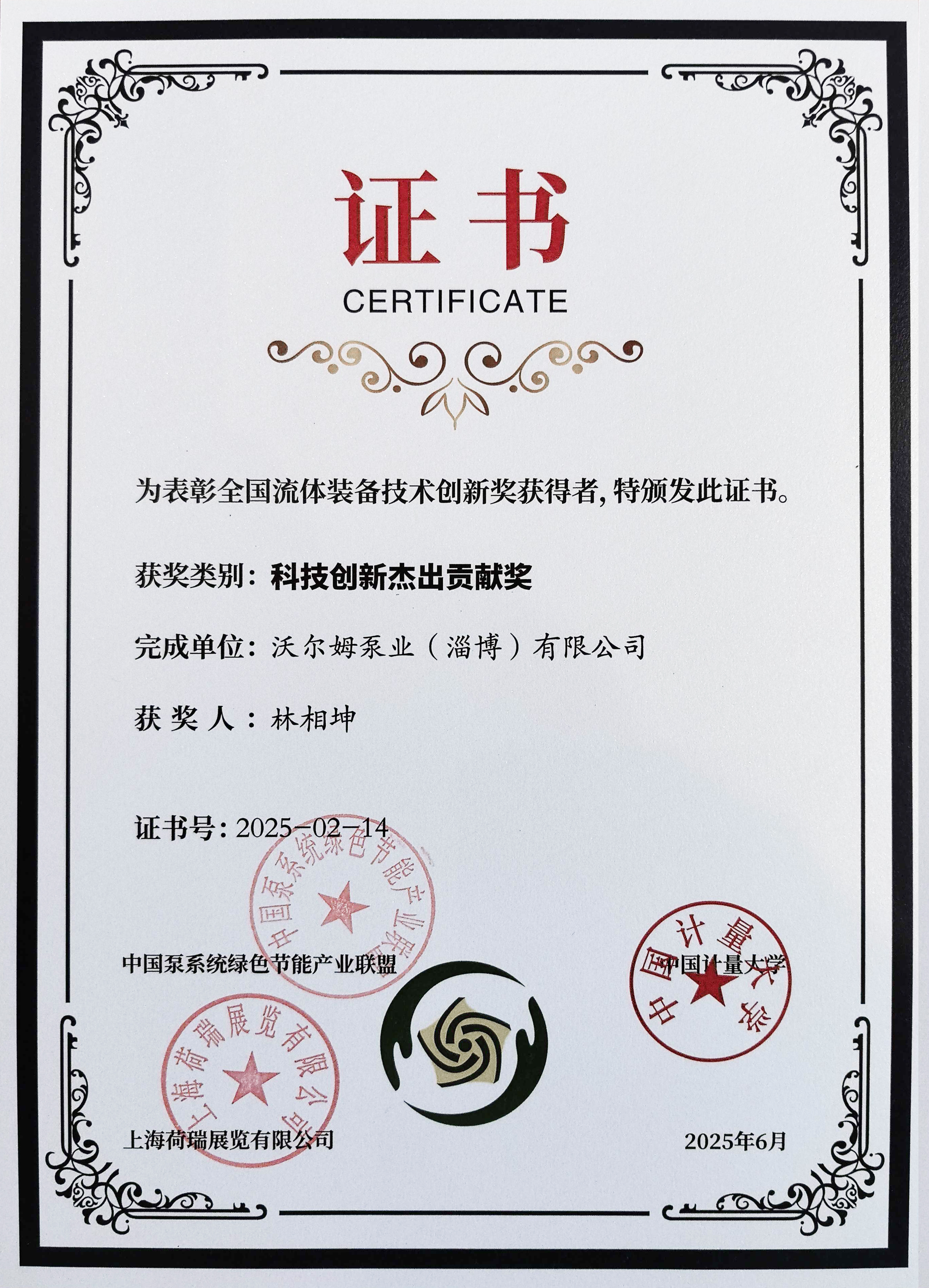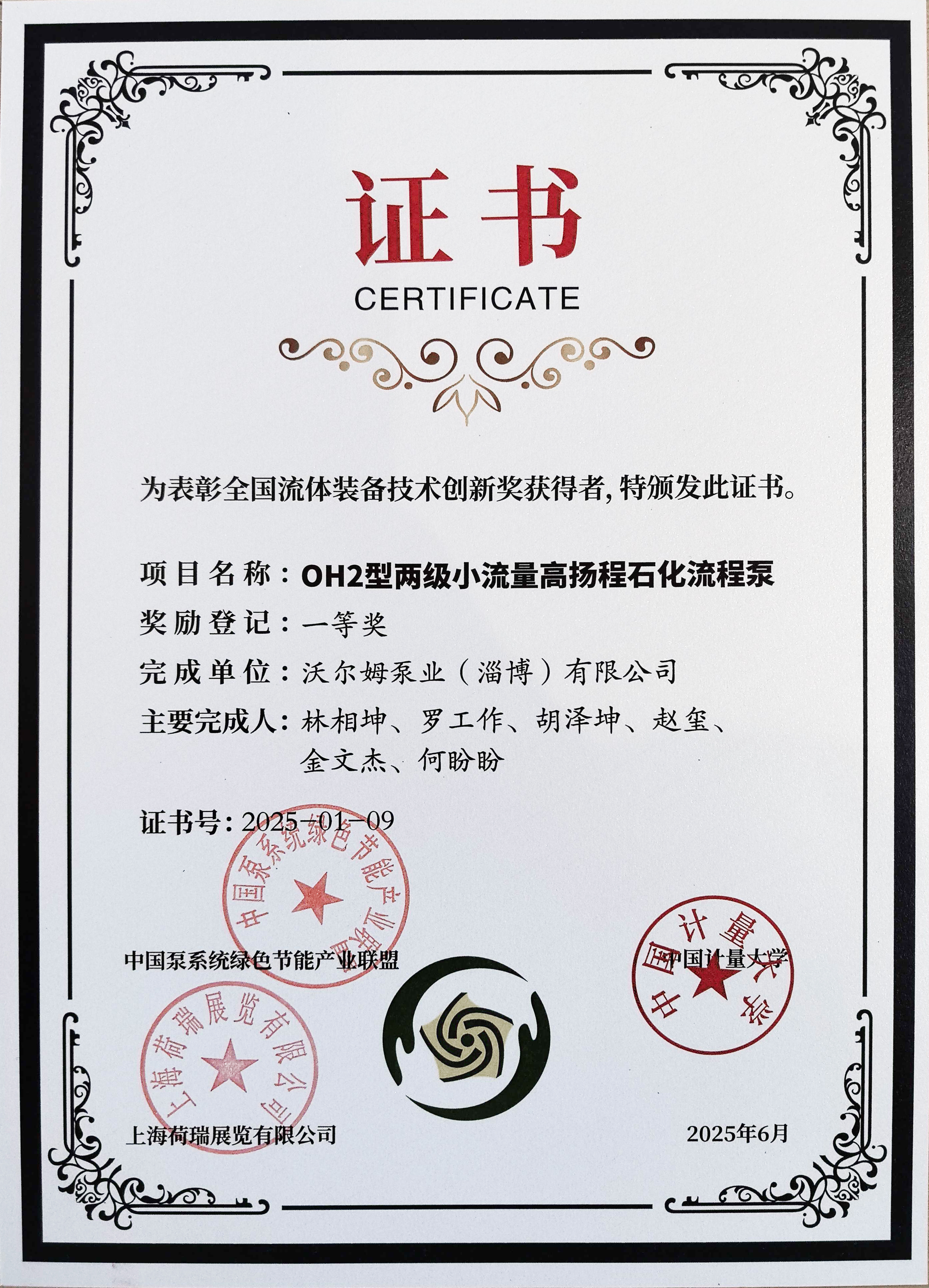 6月4日,在上海舉辦的第十三屆國際泵閥展會上,沃爾姆泵業憑借“OH2型兩級小流量高揚程石化流程泵”獲得第四屆全國流體裝備技術創新獎一等獎,董事長林相坤獲得個人科技創新杰出貢獻獎。
